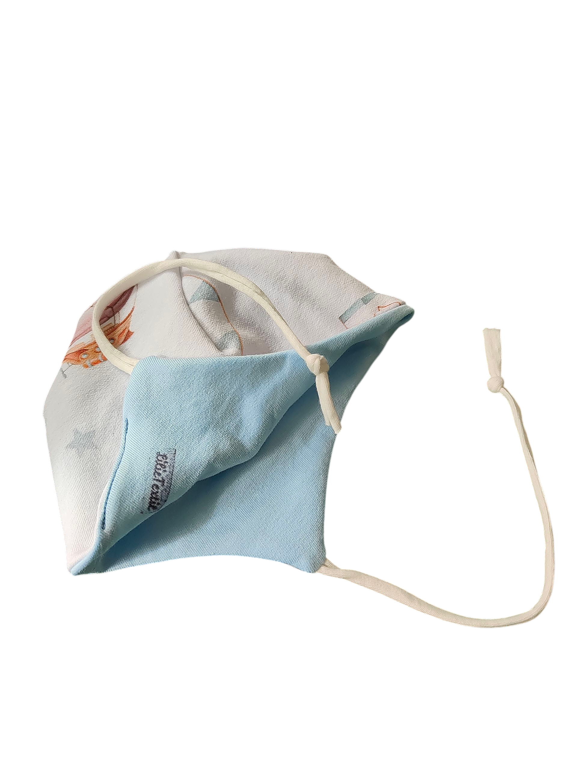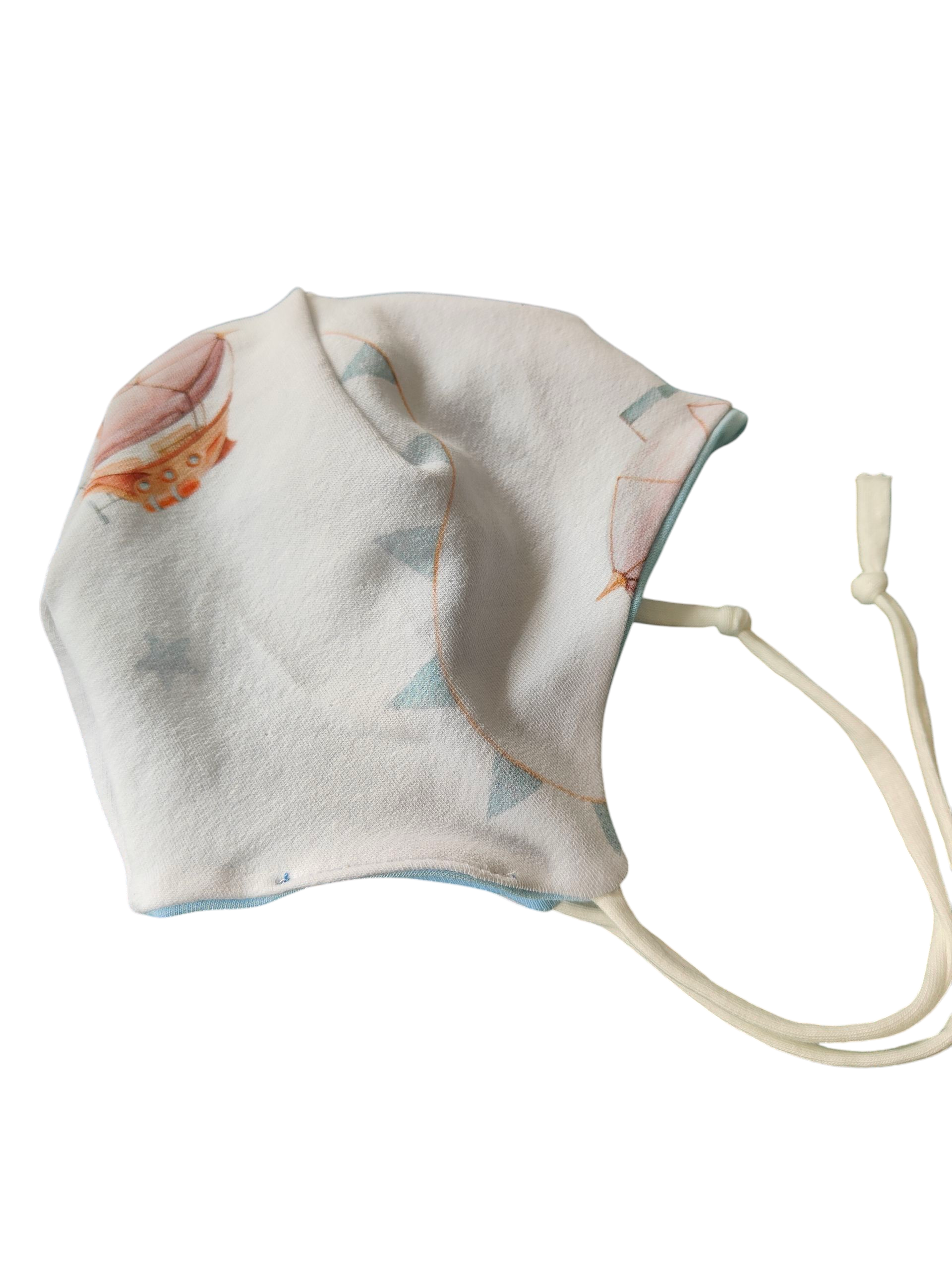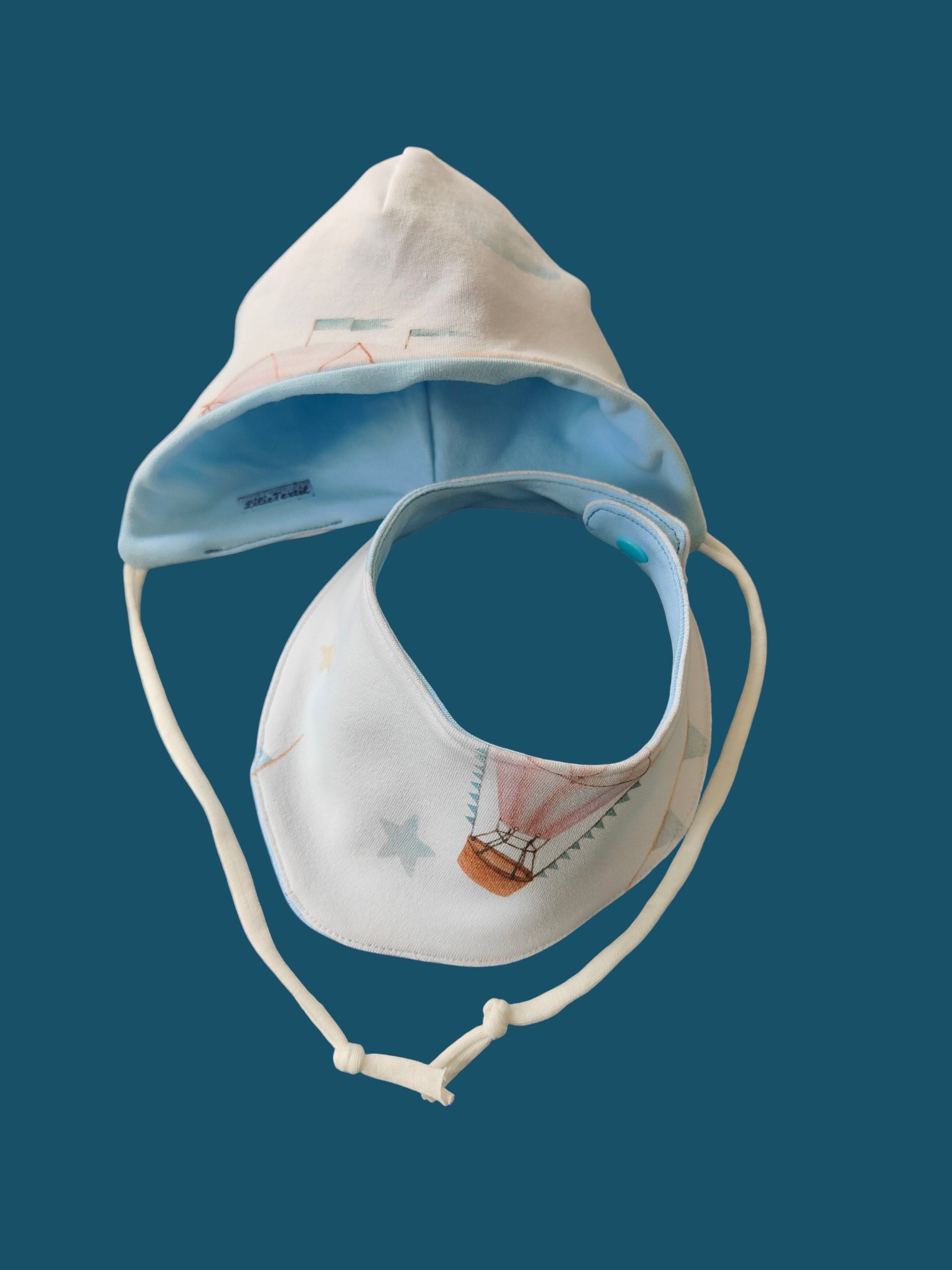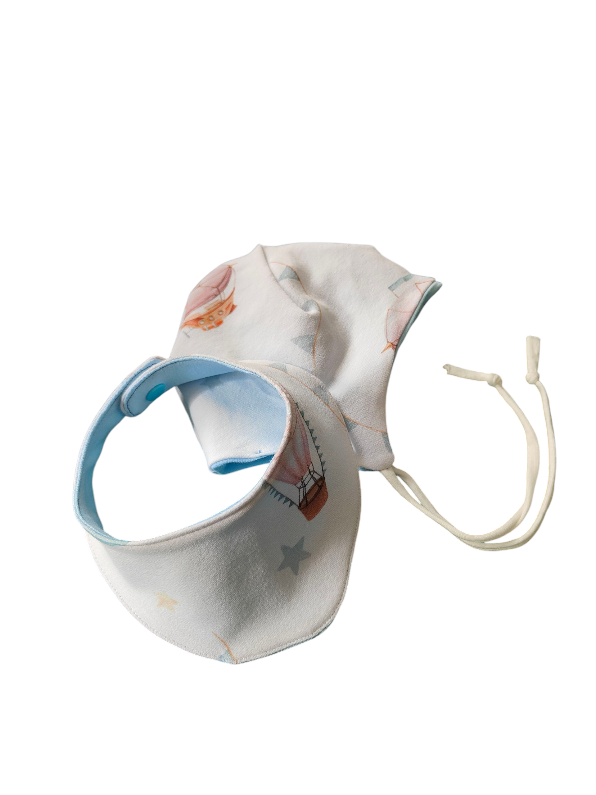 Babymütze mit Halstuch aus Baumwollsweat/Heißluftballon/weiß/hellblau